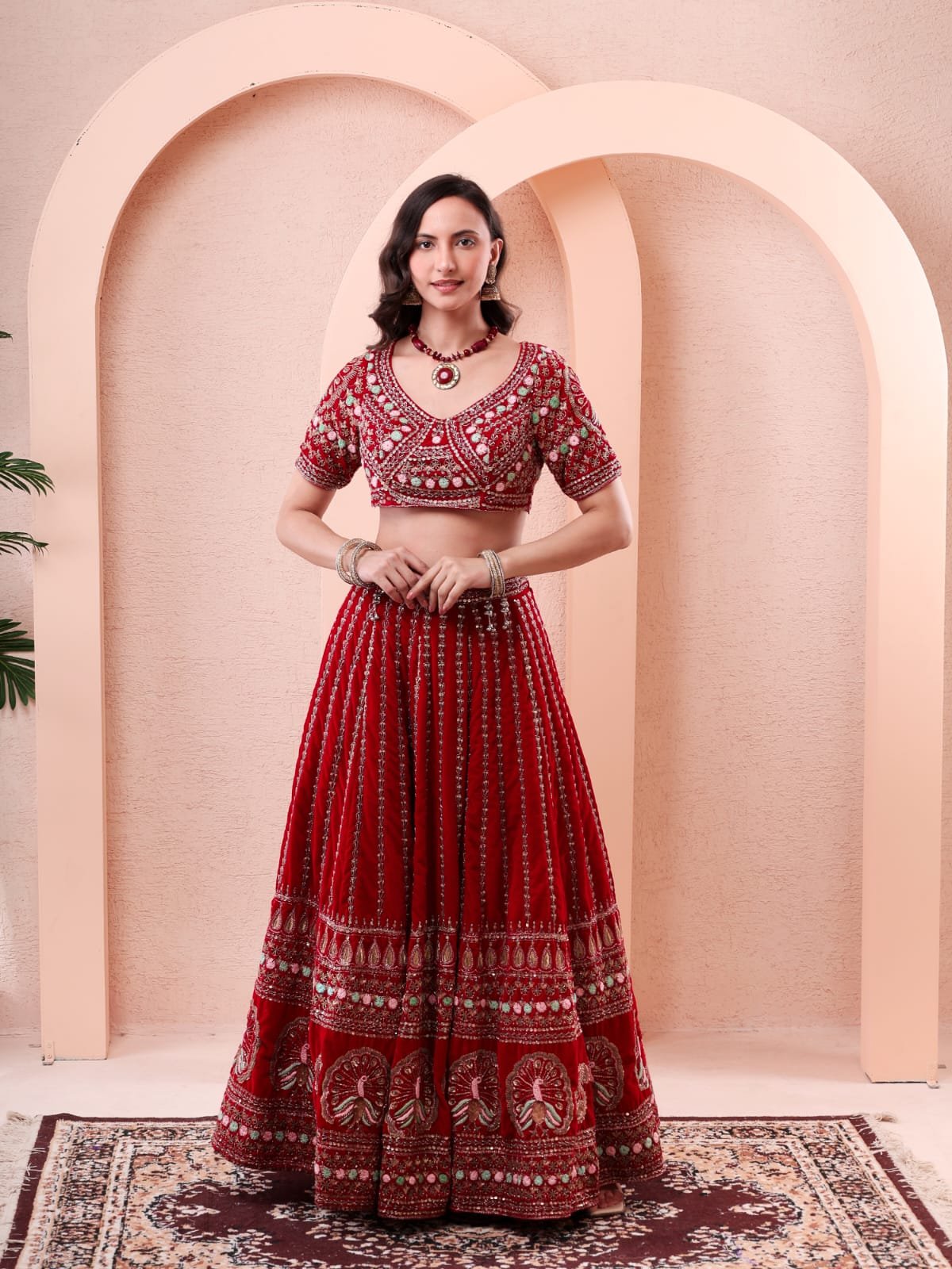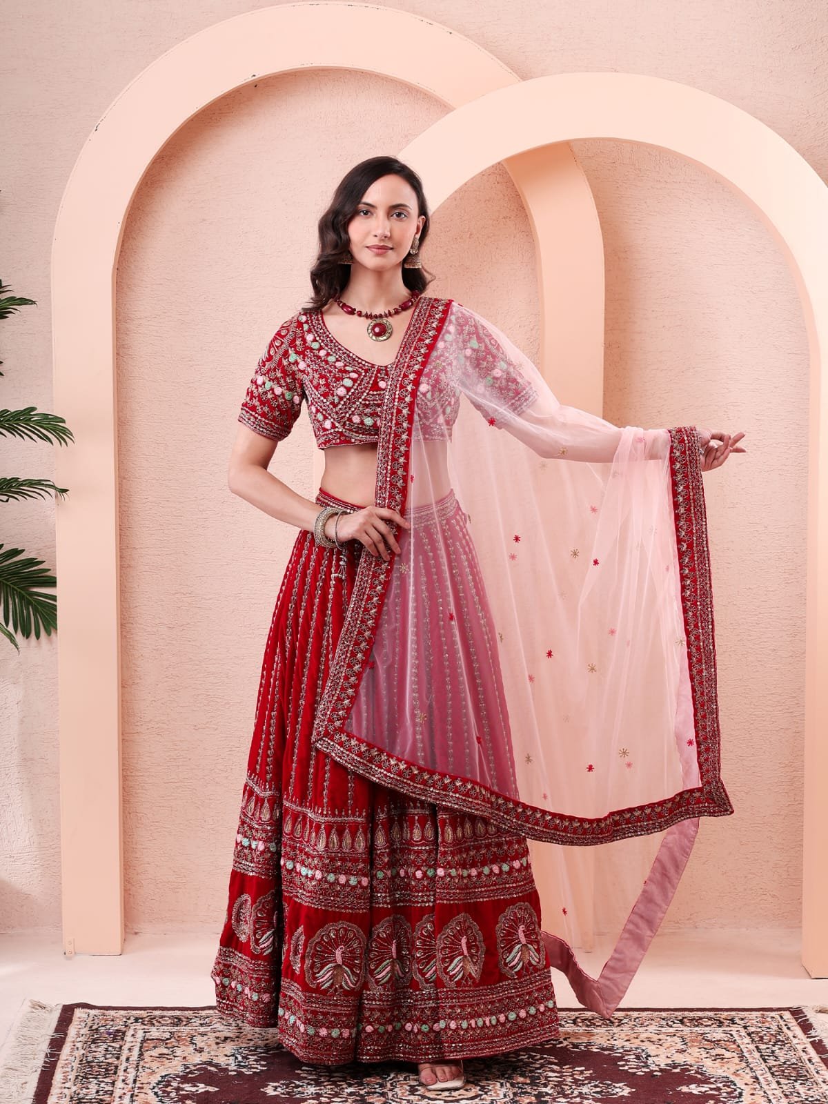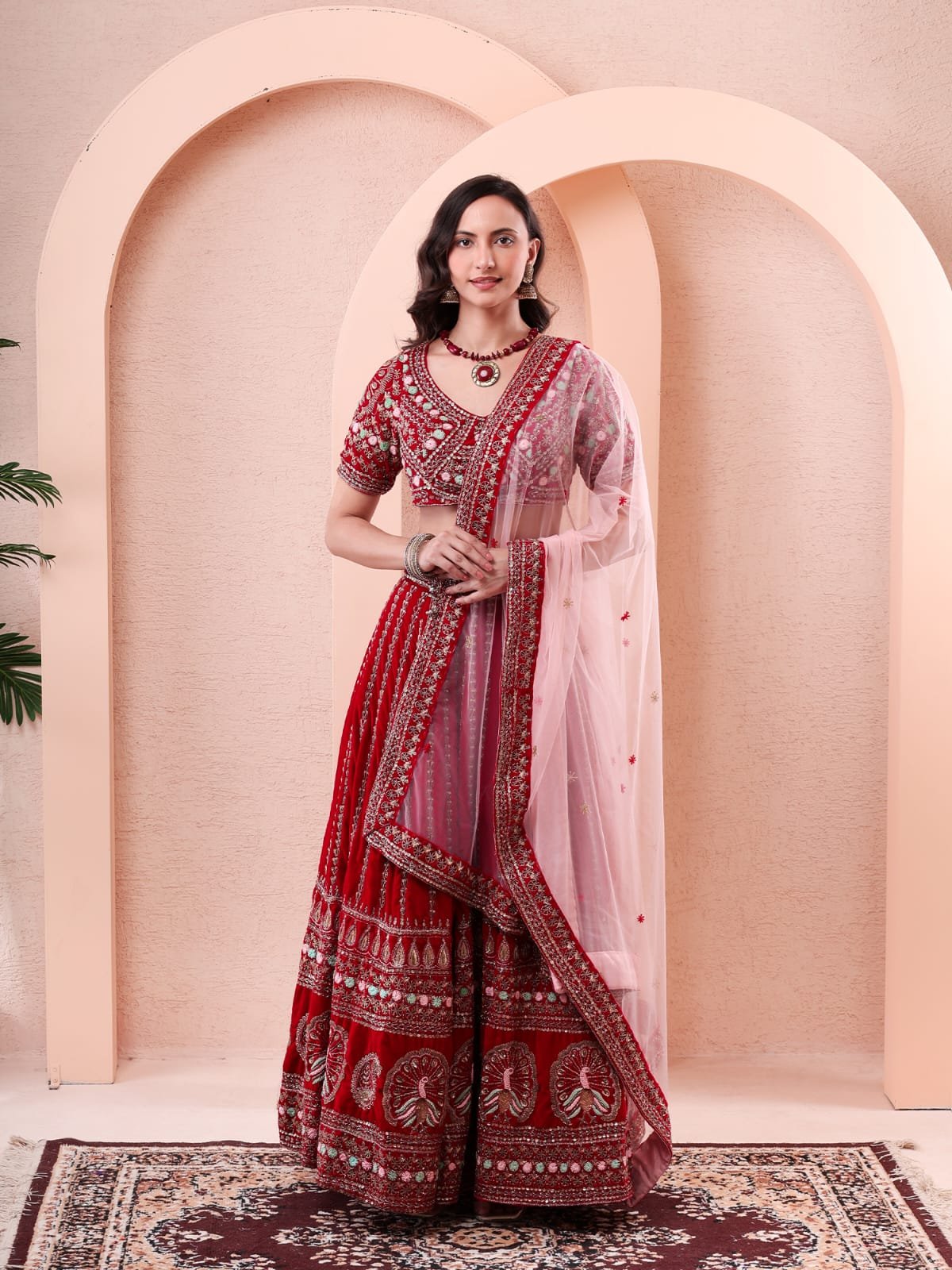 Constructed from premium velvet, the Rosy Bridal Lehenga is as comfortable as it is stunning. The fabric’s luxurious feel ensures that you remain comfortable throughout your big day. To maintain its pristine condition, the garment is best cared for with professional dry cleaning, allowing the embroidery and velvet fabric to retain their rich look and feel over time. Delivery timelines are designed to accommodate careful handiwork, ensuring you receive a well-crafted masterpiece when you need it.