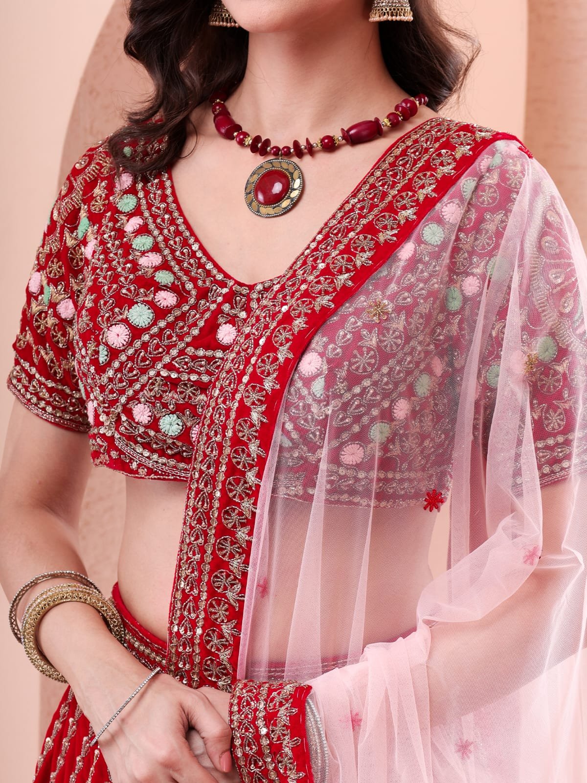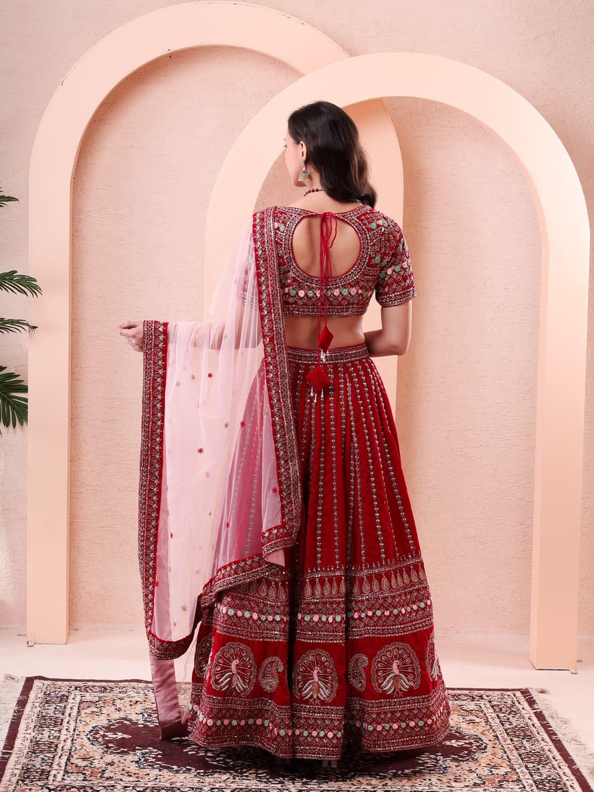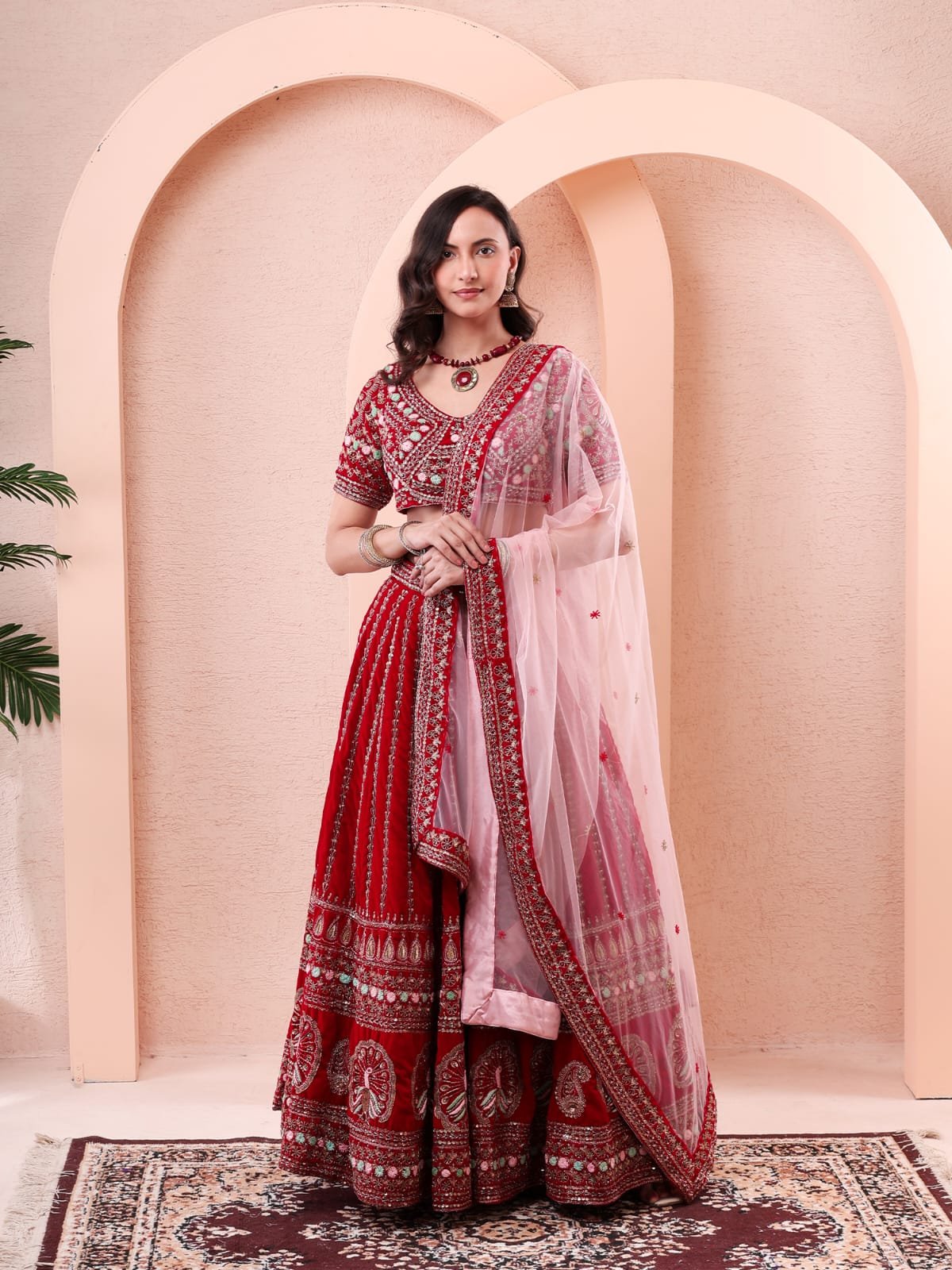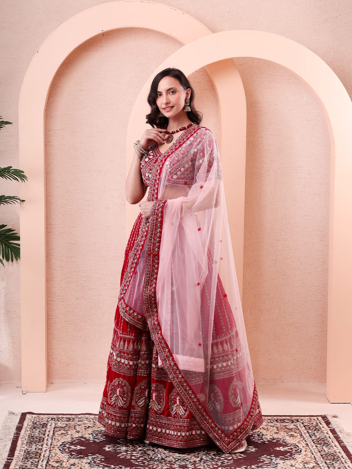 Constructed from premium velvet, the Rosy Bridal Lehenga is as comfortable as it is stunning. The fabric’s luxurious feel ensures that you remain comfortable throughout your big day. To maintain its pristine condition, the garment is best cared for with professional dry cleaning, allowing the embroidery and velvet fabric to retain their rich look and feel over time. Delivery timelines are designed to accommodate careful handiwork, ensuring you receive a well-crafted masterpiece when you need it.