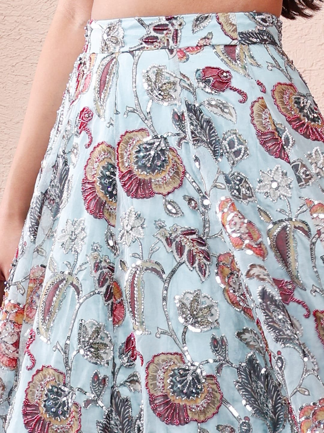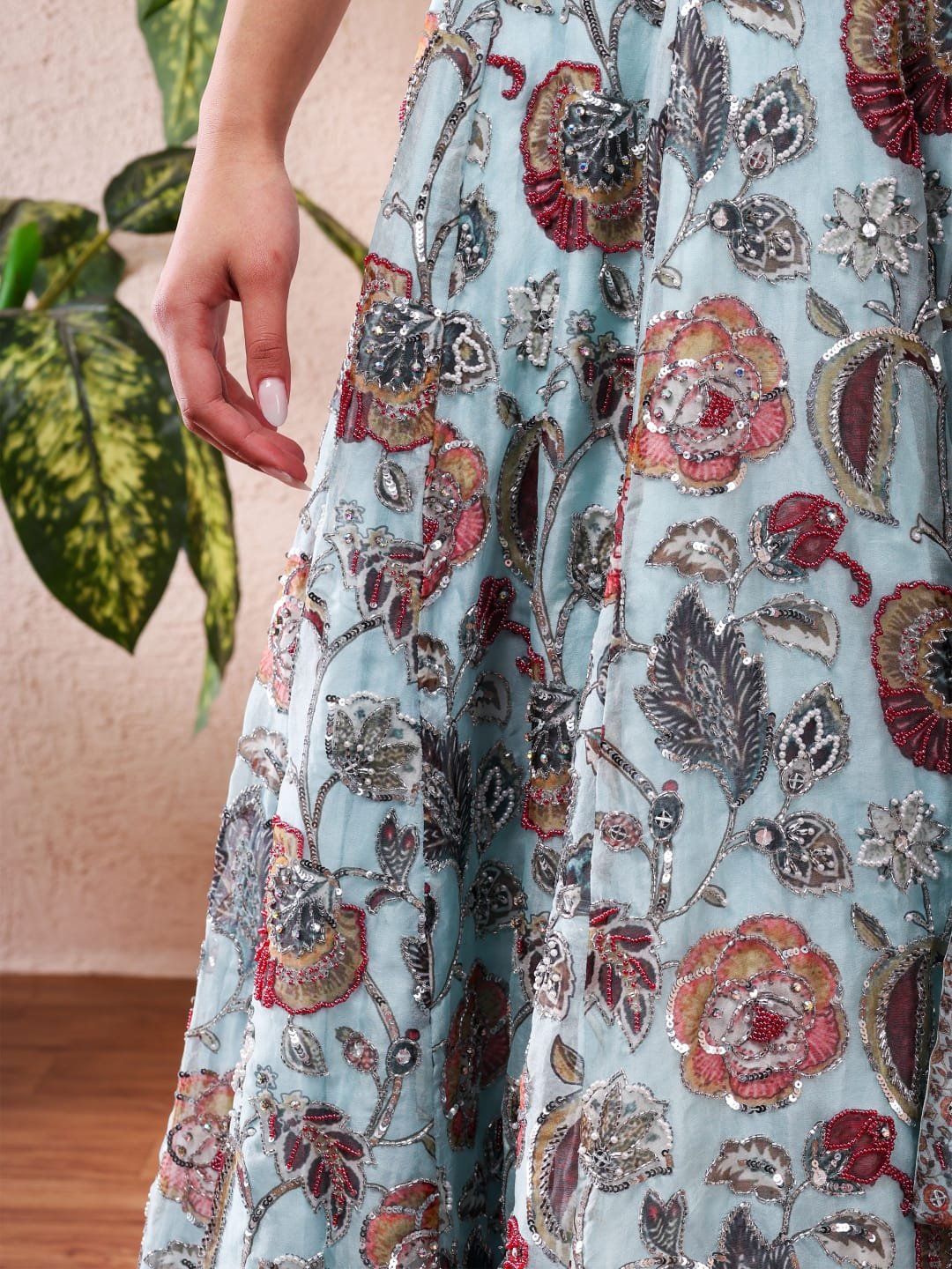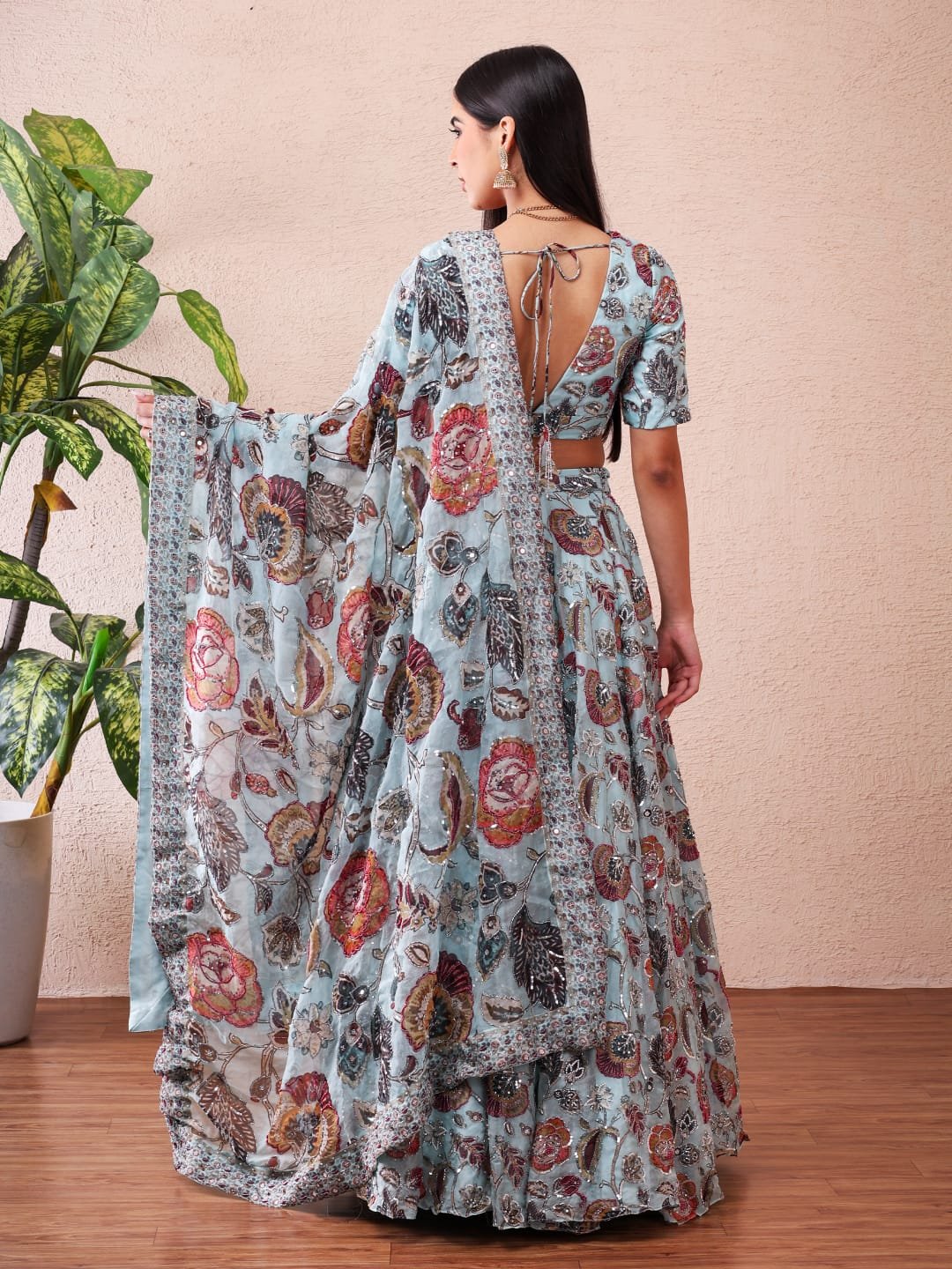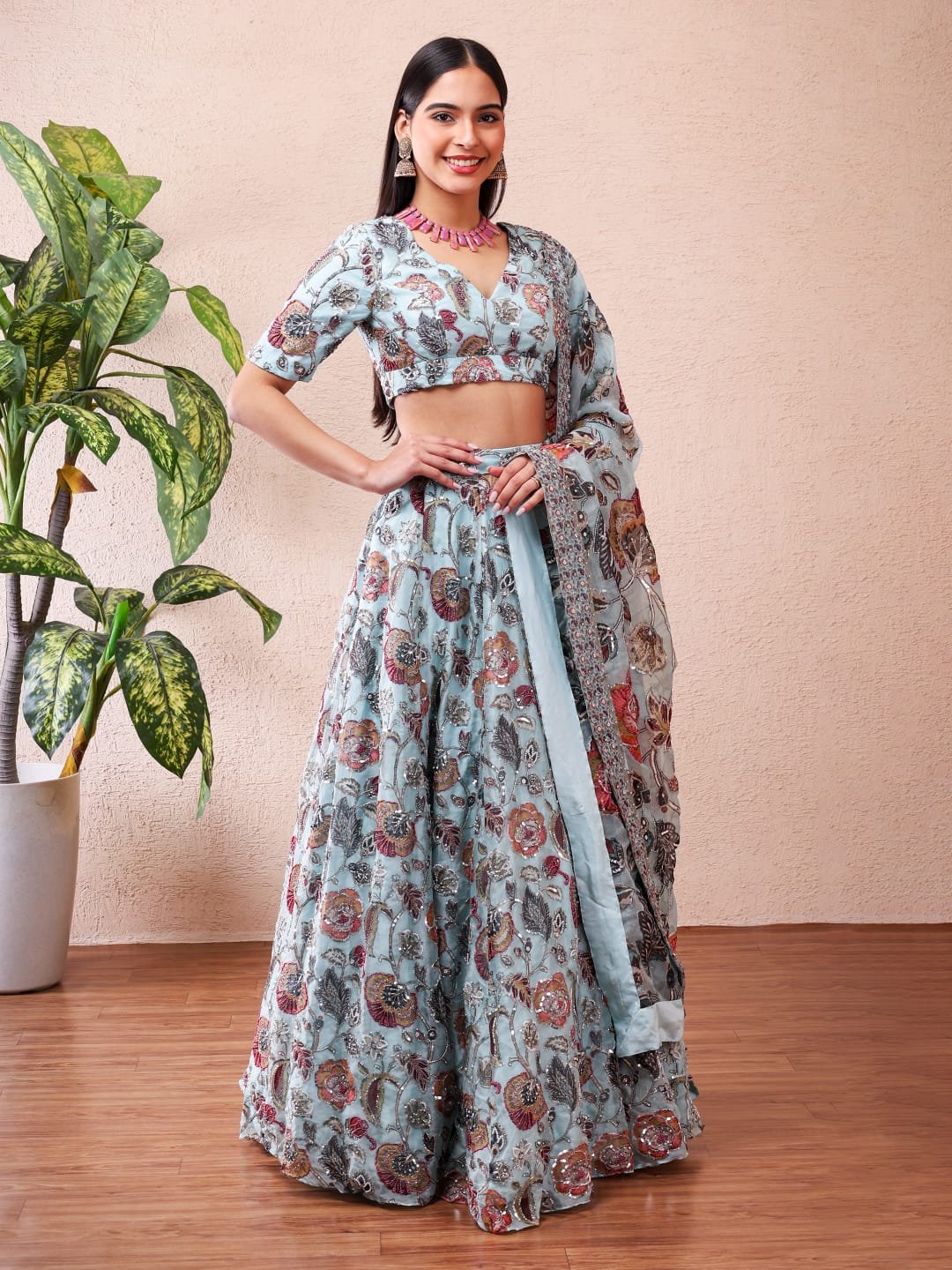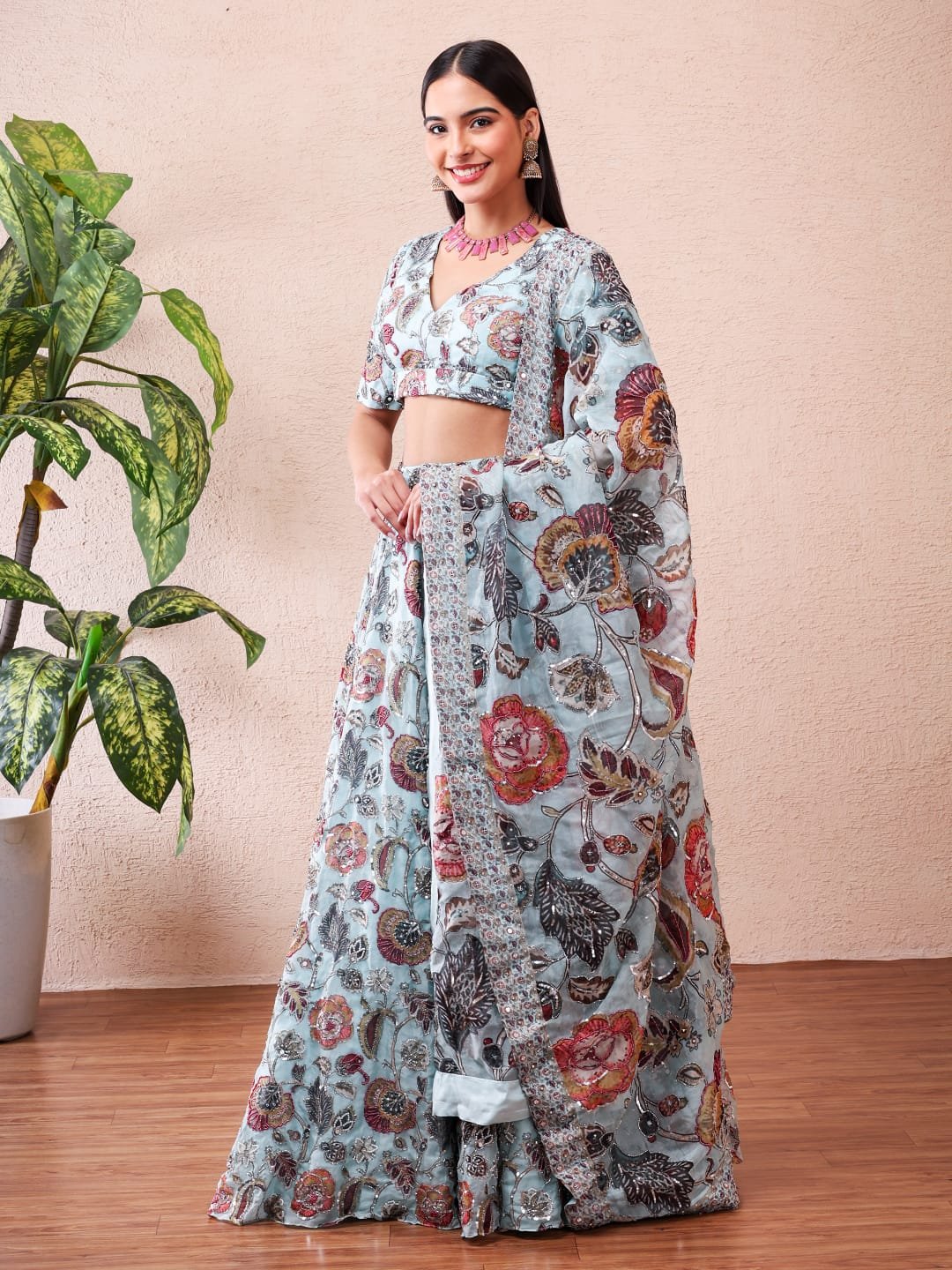 Introducing Saniya, a refreshing statement of modern elegance from Anam Bridals — an exquisite Aqua Printed Lehenga Set designed for the contemporary bride and celebratory occasions. Crafted in premium Silk Organza fabric, this lehenga features a graceful aqua base adorned with rich floral prints and intricate detailing that create a perfect balance between luxury and lightness. The blouse offers a tailored silhouette, while the flowing printed lehenga and coordinated dupatta complete the ensemble with effortless sophistication. Lightweight yet opulent, Saniya is ideal for pre-wedding functions, engagement celebrations, cocktail evenings, and festive gatherings where elegance meets comfort.