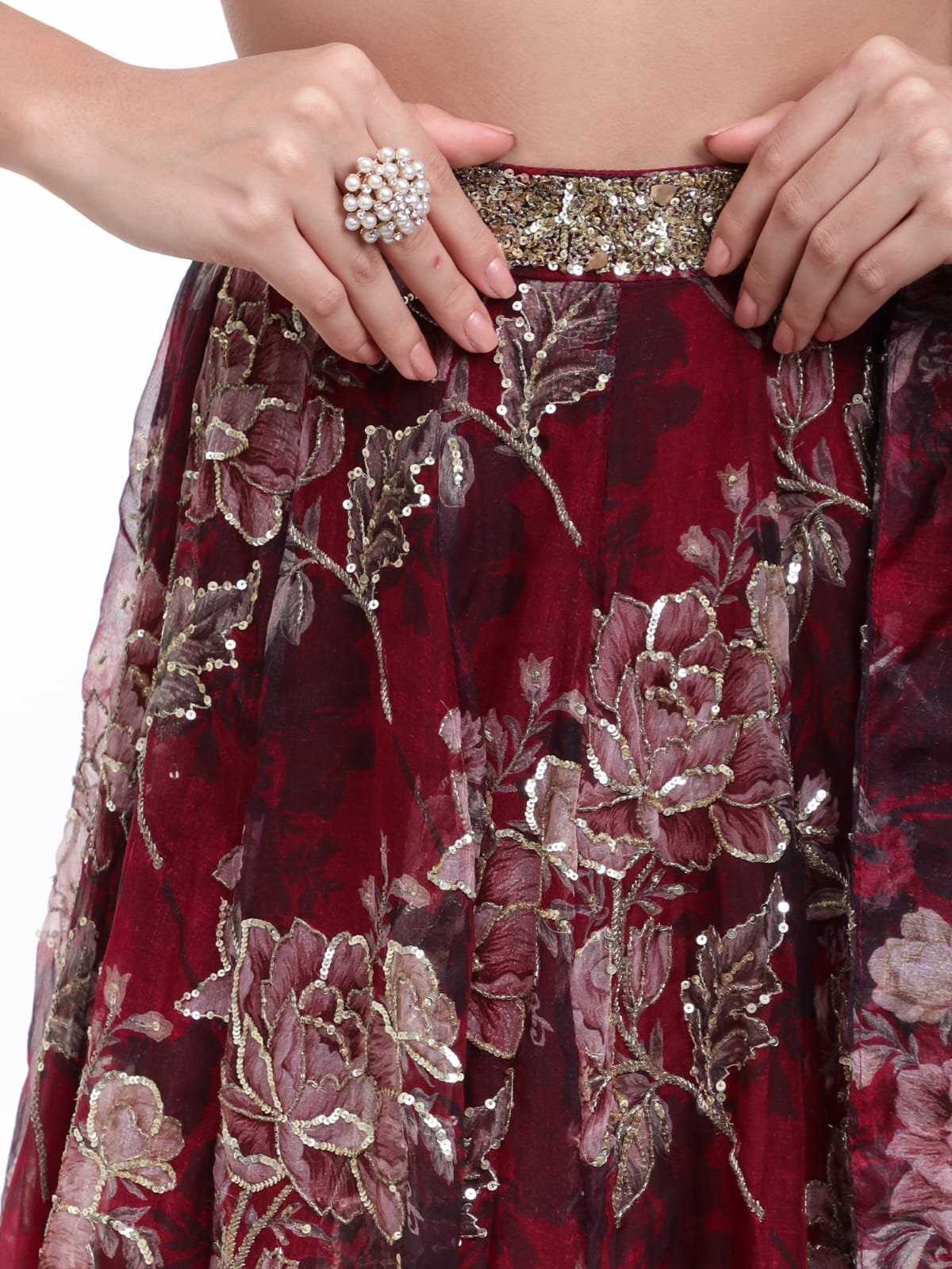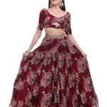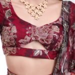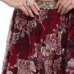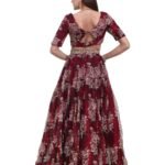 Make a bold statement with this luxurious Wine Printed Lehenga from the Anam Bridal Collection. Crafted from rich Silk Organza fabric, this exquisite ensemble showcases an enchanting blend of modern artistry and traditional craftsmanship. The deep wine hue combined with delicate floral prints creates a perfect balance of grace and sophistication.