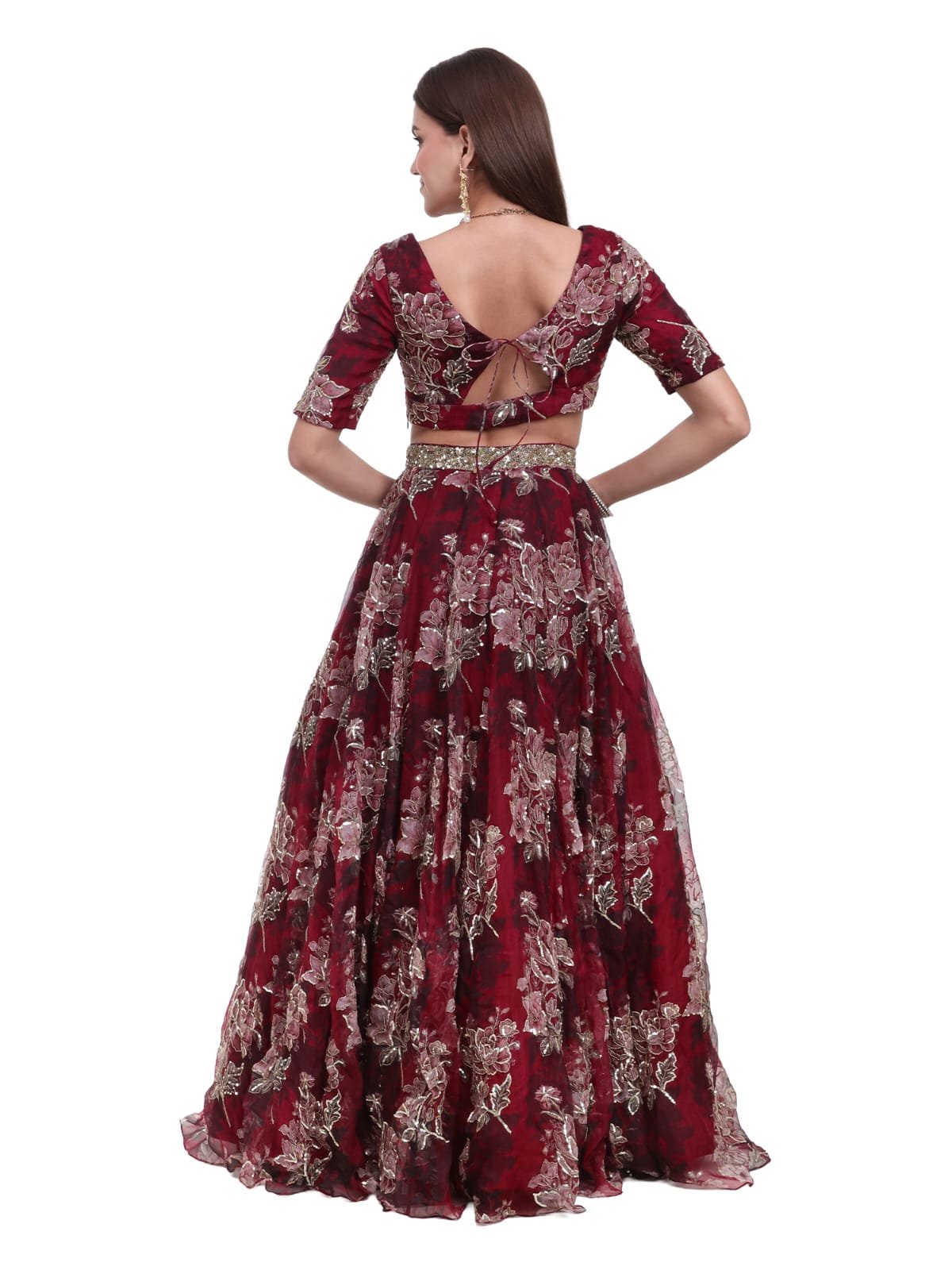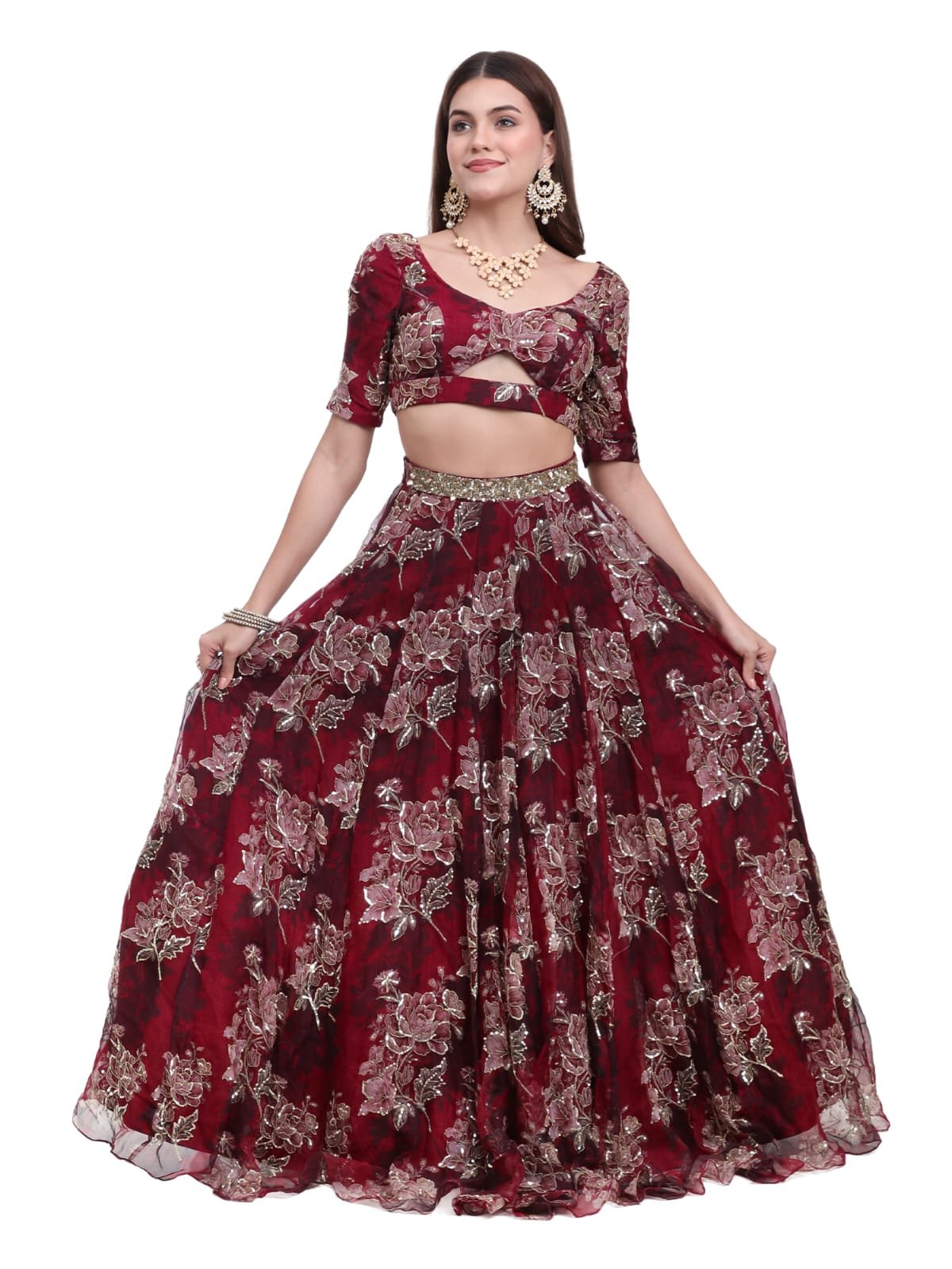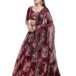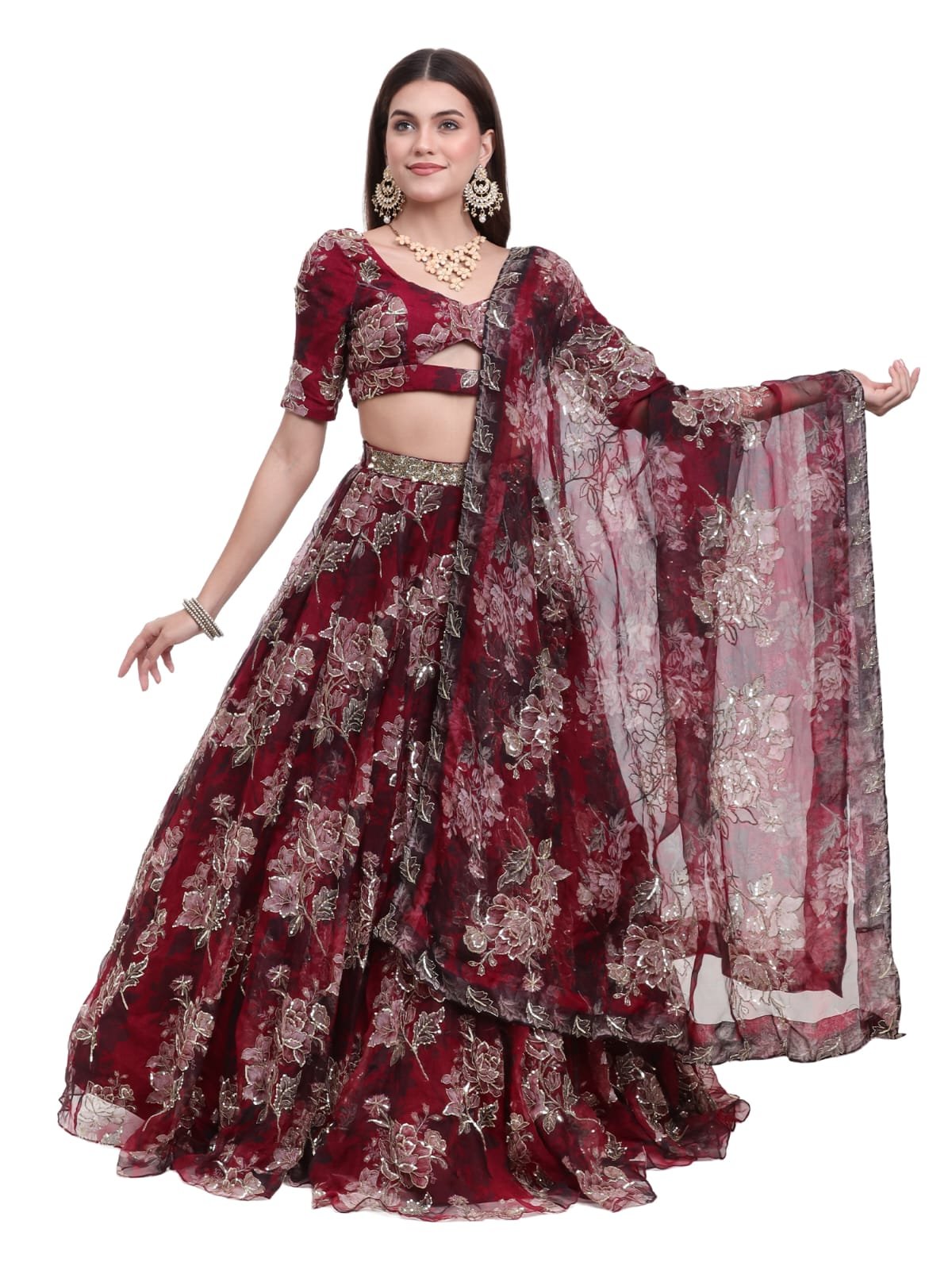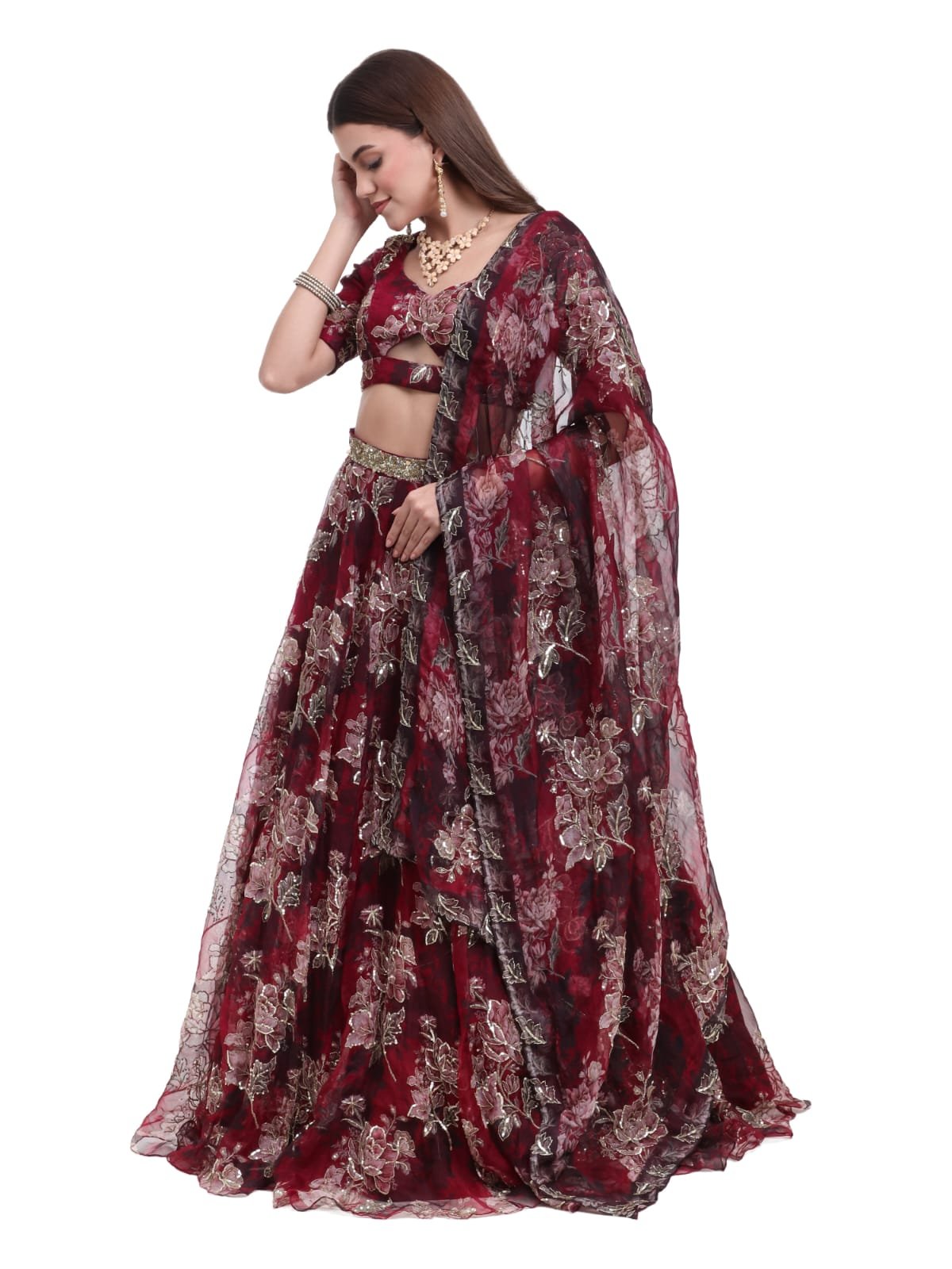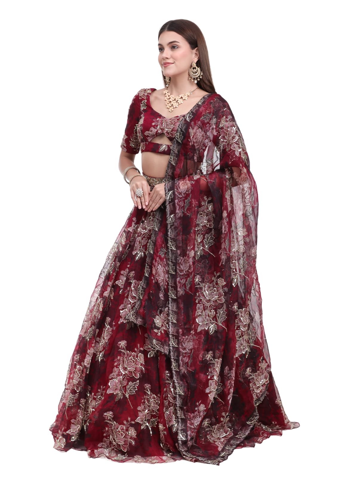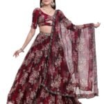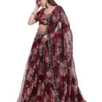 The outfit includes 4 components — a beautifully designed blouse, a flowing printed lehenga skirt, a matching dupatta, and an elegant belt to complete the ensemble. The lightweight silk organza fabric ensures both comfort and fluid movement, making it ideal for festive and bridal occasions.